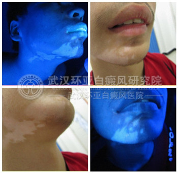 初诊:患者下颚有大片白斑,呈现散发性分布,伍德灯下白斑边缘模糊,大片白斑周围撒布一些小块斑点,数据分析发现具有扩散趋势,建议尽快采取治疗措施防止白斑扩散。