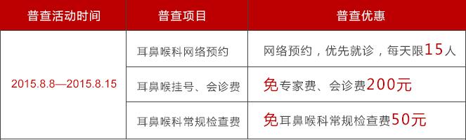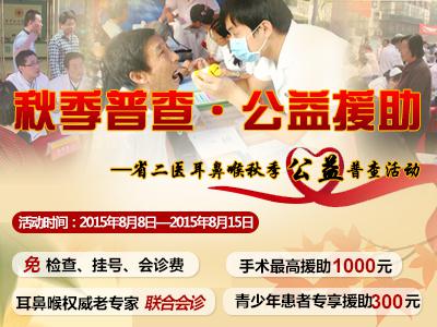 8月我们迎来了24节气之一的立秋,它是秋季开始的节气。步入秋季以后,细菌、病的繁殖速度加快,耳鼻喉疾病的侵袭甚至比以往更加严重,为了帮助广大耳鼻喉患者在初秋之际及时诊治疾病,为回馈广大耳鼻喉朋友的信任与关注,贵州省第二人民医院特开展大型“耳鼻喉秋季公益普查活动”,特聘北上广专家联合坐诊,誓以精湛技术,公益援助,保障耳鼻喉患者健康。(活动时间:2015.8.8—2015.8.15)