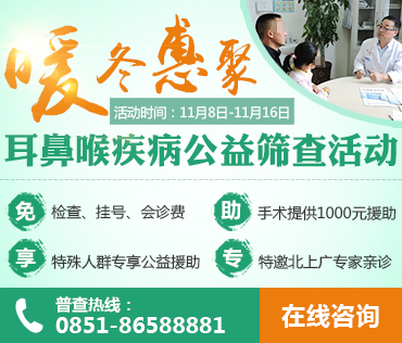 寒冬渐近,耳鼻喉疾病逐步进入高发期,为进一步贯彻落实卫生部关于医疗制度改革的精神,进一步提升广大耳鼻喉患者的健康意识,树立科学、规范的耳鼻喉疾病诊疗体系,提高医疗服务的透明度;贵州省第二人民医院主办的"2015“暖冬惠聚”大型耳鼻喉公益筛查活动正式启动。(活动时间:2015.11.8—2015.11.16)