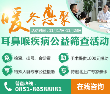 寒冬渐近,耳鼻喉疾病逐步进入高发期,贵州省第二人民医院举办的大型耳鼻喉疾病公益筛查活动反响热烈,应广大耳鼻喉患者要求,且为进一步贯彻落实卫生部关于医疗制度改革的精神,进一步提升广大耳鼻喉患者的健康意识,树立科学、规范的耳鼻喉疾病诊疗体系,提高医疗服务的透明度;贵州省第二人民医院主办的"2015“暖冬惠聚”大型耳鼻喉公益筛查活动暖心升温,公益筛查温暖继续。(活动时间:2015.11.17—2015.11.23)