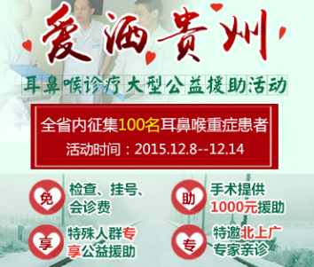 冬季是治疗耳鼻喉疾病的最佳时机,为了减轻广大患者精神和经济的双重负担,让每一位耳鼻喉患者都得到正规、科学、规范的检查和治疗,早日解除耳鼻喉顽疾,贵州省第二人民医院推出爱洒贵州耳鼻喉诊疗大型公益援助活动,于2015年12月8日--12月14日全城开启,在全省范围内征集100名耳鼻喉重症患者,因名额有限敬请预约。