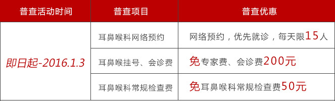 贵州省第二人民医院48周年感恩回馈暨“喜迎元旦”大型耳鼻喉公益会诊活动特为耳鼻喉患者开通网络提前预约通道。同时,根据患者咨询,30分钟问诊,3个月跟踪服务,建立长期健康档案。为保证患者就医质量,网络预约每天限15人。