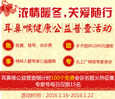 2016“浓情暖冬,关爱随行”耳鼻喉健康公益普查活动特为患耳鼻喉患者开通网络提前预约绿色通道。同时,根据患者咨询,30分钟问诊,3个月跟踪服务,建立长期健康档案。为保证患者就医质量,网络预约每天限15人。