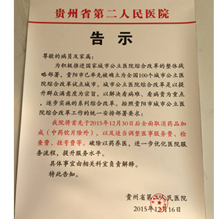 为积极推进国家城市公立医院综合改革的整体战略部署,贵阳市已率先被确立为全国100个城市公立医院综合改革试点城市。城市公立医院综合改革是以提升群众满意度为宗旨,以解决看病难、看病贵为重点,逐步实施的系列综合改革、按照贵阳市城市公立医院综合改革工作的统一安排部署要求我院将首先于2015年12月30日后全面取消药品加成(中药饮片除外),以及适当调整医事服务费、检查费、挂号费等。